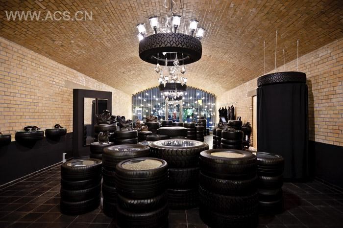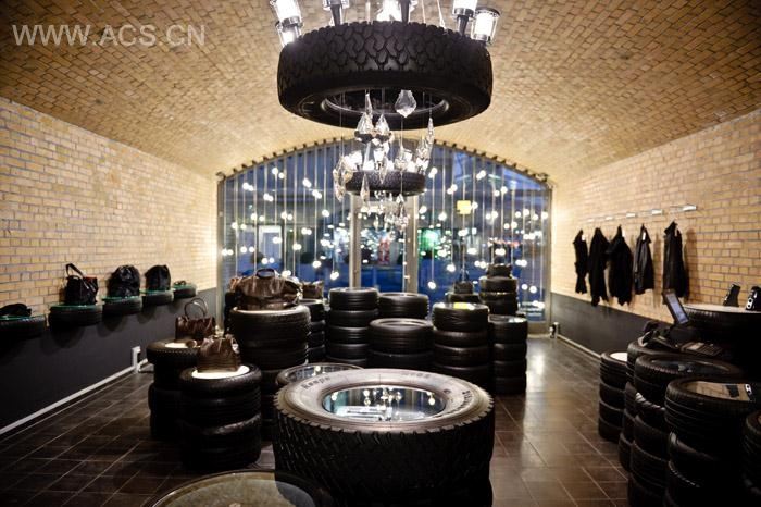 大约四吨的轮胎,展柜由轮胎加上白色玻璃制成,里面配上LED灯;桌子,货架,更衣间,甚至吊