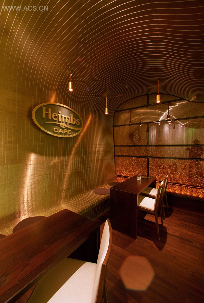 空间中心主要是柜台,展示着“即时即地”的咖啡豆。设计师与OKALUX 公司合作定制了陈列在透明硅箱中的咖啡豆镶嵌装饰。空隙处发出LED背景光,就像灼热的火焰。整个环境上方是一张大型黄铜网,由GKD公司制造,使人联想起网站上原产地日落的形象或公司商标的芬芳曲线。