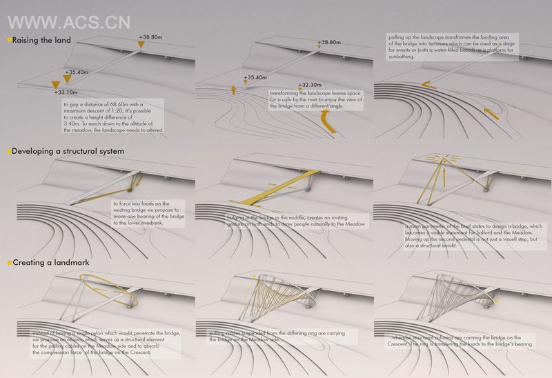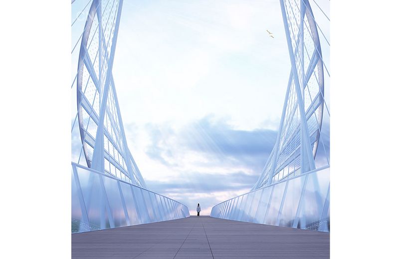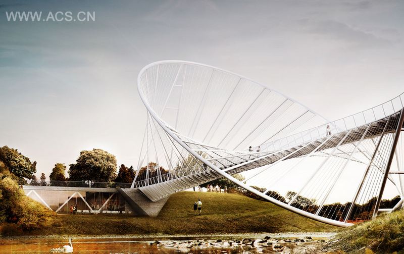 奥地利建筑师Alex Daxb?ck和Chris Precht 组建的penda工作室给我们分享了他们的O项目,Meadows Salford 桥竞赛方案。这座桥重新诠释了传统桥梁,其标志性的造型与当地的传统与优雅协调,十分得体的欢迎到访者,并根据来访者位置的移动发生着改变,完成了与人的交互。桥体一侧林着繁忙的道路,一侧联系美丽的草甸,人们从侧面看构架轻盈,逐渐转到正面,构架在视线中从线逐渐变成一个椭圆,最后再到气场十足的正圆,给人们留下了深刻的印象,完成振奋人心的过渡。