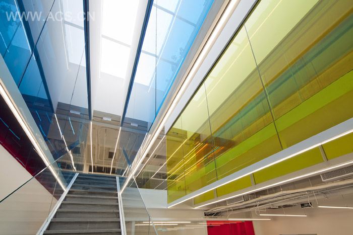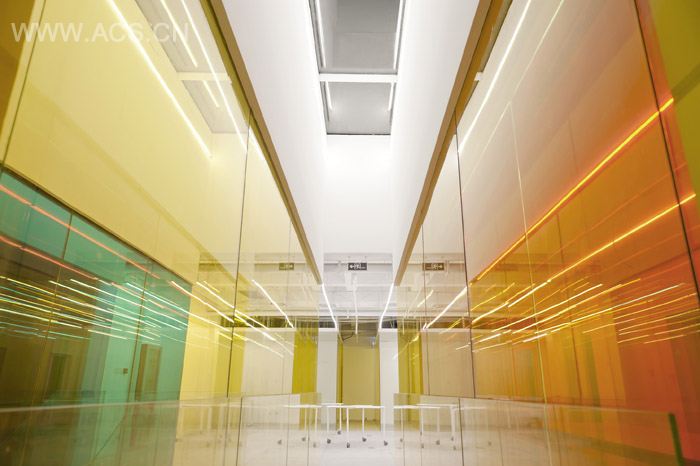 “廿一客”是国内新兴的蛋糕食品专业公司,我们为他们设计了北京办公总部的室内空间。我们利用红、黄、蓝三色的叠加与渗透,在空间内部填满各式各样的色彩效果。方法是将行走路径面对或侧旁的墙面设计为不同的彩色玻璃,通过人在空间中的移动,观看玻璃的角度与层数的变化,颜色的叠加及光线的各种反射,构建出一个无比虚幻的色彩世界。而二层通高的中庭是这个世界的中心,因为有直射的阳光和更多层的彩色玻璃,能够形成最为绚丽、玄妙的色彩效果。