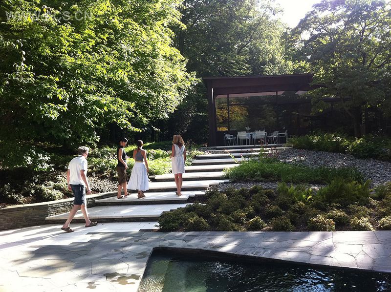 建筑材料筑成的通道成为连接风景和建筑的缔结组织。白色的混凝土路面从屋内延伸到室外,与青石路面环环紧扣,形成通向泳池平台的小道。白