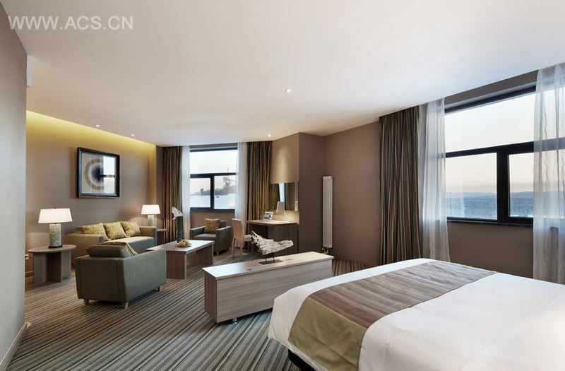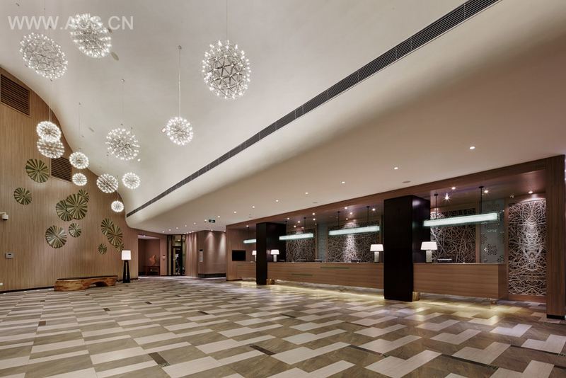 在保持其连锁酒店风格的界定上,无论是大堂抛物线形层叠的天花,会议室绿意渐变的地毯,还是餐厅中央的地灯、透视感的屏风等装饰小品,都融入了轻快、动感的感情基调。而大堂与大堂吧的会谈区、餐厅用餐区的开放性空间设计,更巧妙模糊掉了商务功能区带来的严肃压抑的弊端。卧室的暖色光线则为度假的身心送去了恰到好处的舒适美感。