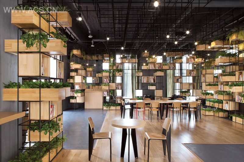咖啡馆内部由建筑钢筋搭建起来的栅格结构分隔内部空间,同时在栅格中融入盆栽、书柜及灯饰等多种功能,营造了一处温室花园的氛围。在这里品尝一个下午茶,不仅舒缓了都市的紧张节奏,同时也获得了回归田园的生活体验。