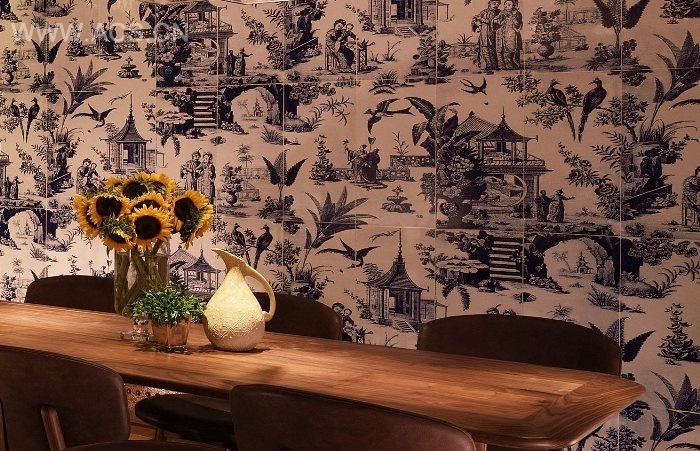 吧在餐厅尽头楼梯处,这是一个温暖私密的地方,有18座。墙面是白底蓝纹瓷砖,非常