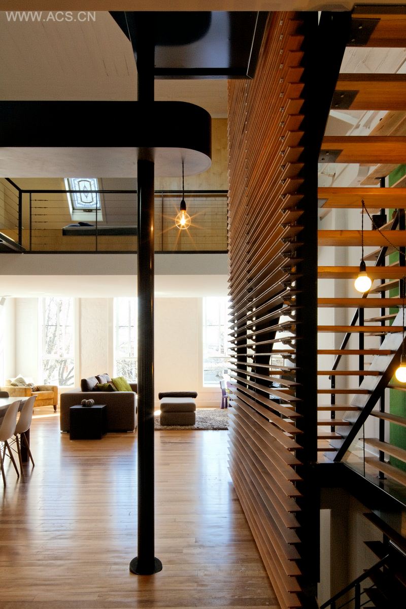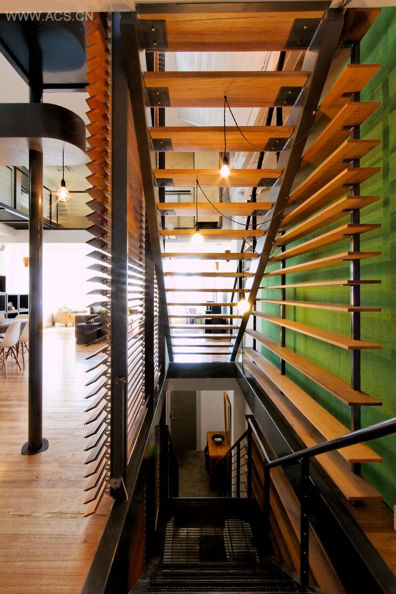 屋顶上可行走的玻璃层,位于螺旋形楼梯的旁边,形成了一个视觉上的联系并让太阳光进入到下面的生活区。可穿透三层公寓的光线效果不能被轻视。再者,活动百叶窗也协助控制光线进入。
