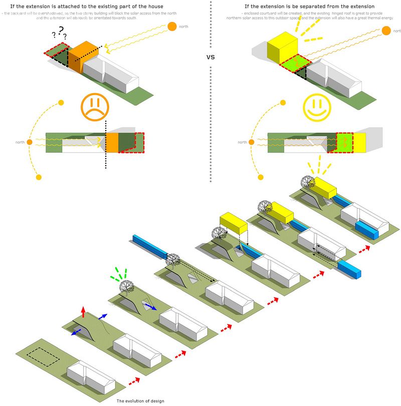 不再重复过去的错误,也不从后部延伸出一个新的结构,该项目建议在房子后面的边界——南部边缘建一个新的建筑。新建筑面对太阳利用了诱导式太阳能增益。让其沉浸在太阳光中。新建筑跟原房子是面对面的。