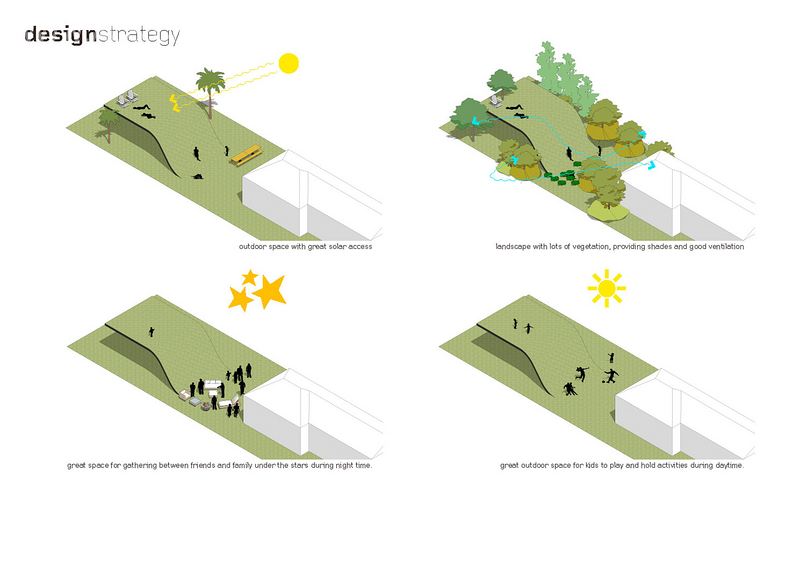 该场地朝北,因此把后院,即该家庭的主要户外空间看成全年都是阴影笼罩的地方。在20世纪90年代扩建的一栋二层建筑在房子内部形成深暗空间的同时进一步减少了太阳的照射。