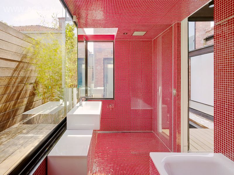 The extension is a d steel skeleton which envelopes the unusually high masonry boundary wall built prior to height restrictions, reclaiming it into the interior. The roof then responds to site setbacks which result in a distorted and subverted answer to regulations. This produces high folded internal planes, allowing double height ceilings, a mezzanine level and spacious interior. The Eastern and Western facades of the extensions are encased in a shield of louvres. These peel back to reveal a folded internal environment of soft colours d by exposed steel beams. Playfully splashes of deep red enliven the interior which is occasionally punctured by windows allowing a cinematic light to dance over the internal workings of the Vader House.