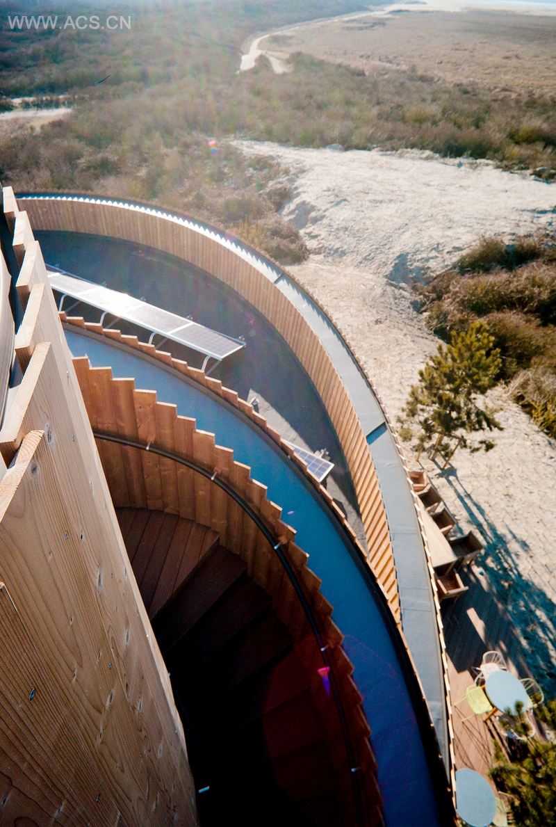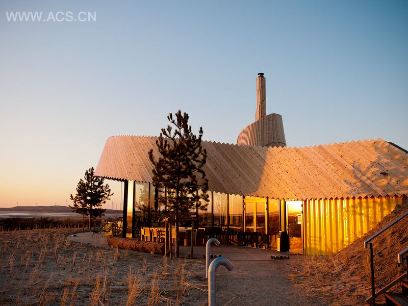 木墙从沙丘开始向上弯曲,卷曲起来形成一个瞭望塔。分层的木材重叠固定在外墙和屋顶上面。未经处理的木材,一直要被煮到不用经过化学处理、清漆或涂料就能耐用为止。多年后它的颜色将产生变化,不同方向有不同的变色。风和太阳将为这个建筑上色,使它成为沙地的微气候预报站。木墙围起餐厅空间,连同所有的玻璃弯曲外墙,旨在指向壮丽的海景。房子后面是混凝土标准的地下室,被埋在沙子下面。