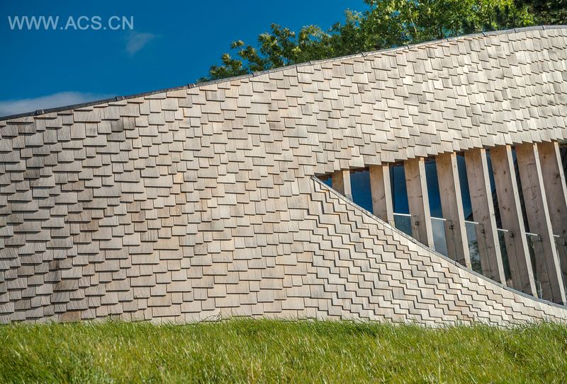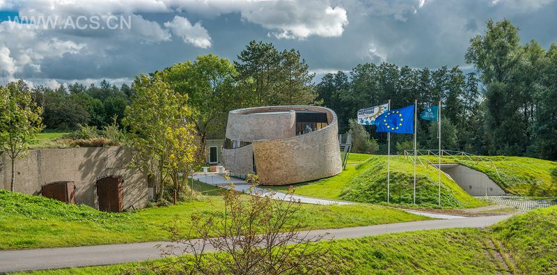 Paviljoen Puur 正好位于前士兵收容所的位置。这个收容所的足迹成为了展馆的基础。在基地周围一面木墙弯曲向上保护着这个遗址并围绕着整个项目。设计的灵感来自于斜坡的起伏形状和周围景观。