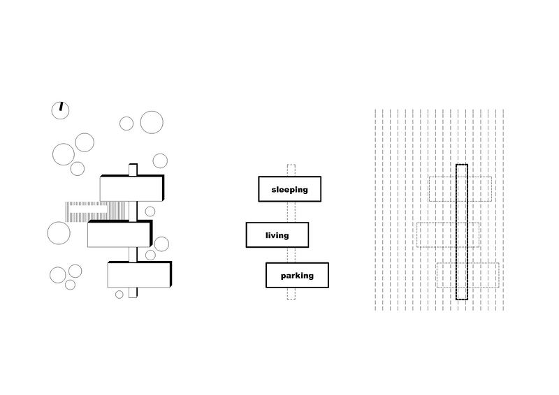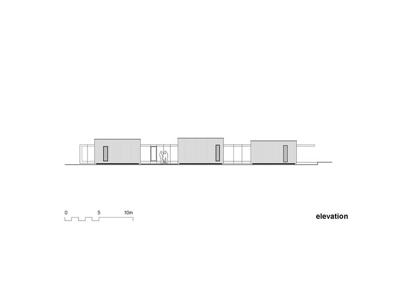 不同的功能区被安排在三个类似于集装箱的房子里。从街道上看,道路主入口处有一顶天蓬,一直通向住宅的玻璃走廊,最后延伸到花园边一个悬空的房间下面。第一个“集装箱”是住宅的车库和仓储室,连接第二个“集装箱”的通道则是住宅的走廊。