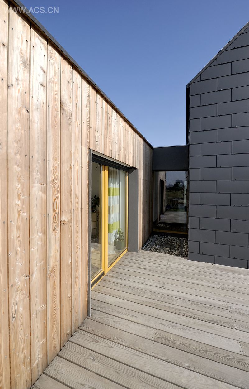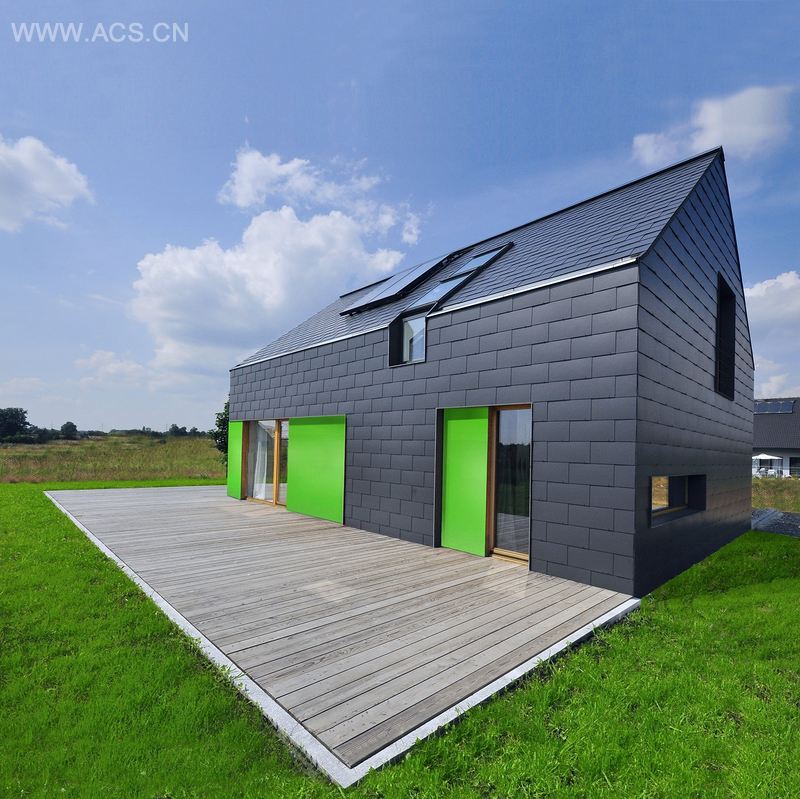 房子的设计灵感来自其所在位置和传统建筑。建筑经济型的布局和紧凑的形状节约了资源、能源和金钱。其结构被分为两部分:一部分是纤维水泥覆盖的双坡屋顶,另一部分是暂时使用的木制立面和平屋顶。该房子使用了诱导式和主导式太阳能组件、绿色材料和技术,包括可回收再利用材料、太阳能电池板和高性能隔热系统。种植了耐干旱植物的绿色屋顶减少通过屋顶传入的热量。房子是在一个非常有限的预算中建成的。