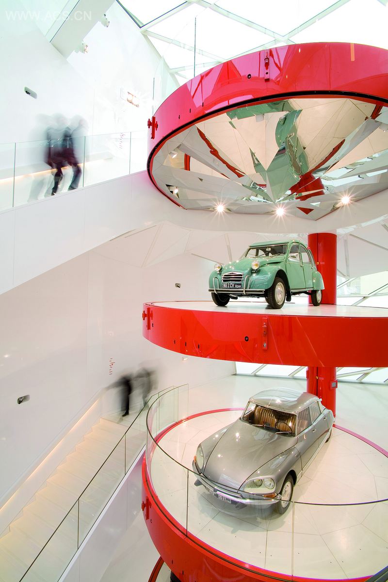 To display the cars themselves, attached to a central mast are eight circular platforms each of which takes a car. The platforms are six metres in diameter, and each one turns to show off the car on all sides and has a mirrored to reflect the car below. Around the display, the public is led by a series of staircases and walkways that spiral past the cars. We were trying to create something like a museum or a cultural building, a space which would encourage people to spend time there. There is a panoramic lift to take people to the top of the building, and they are able to enjoy an exceptional view of both Paris and the sky.