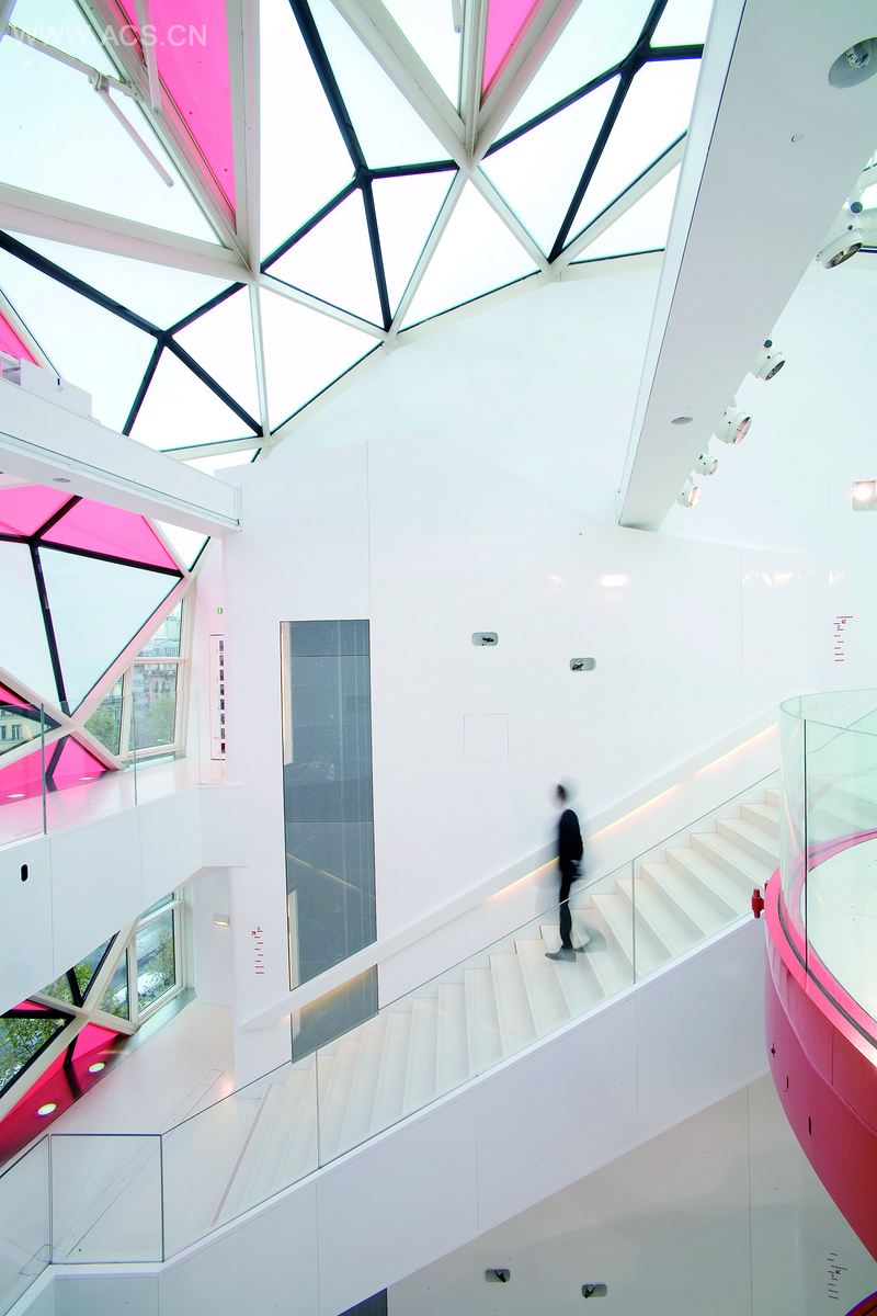 We originally conceived the use of red, the brand’s signature colour, in the glass panels but we decided it would be too bright from the outside. There were some concerns about the building not harmonising with its neighbours on the Champs Elysées, so we’ve created a filter that on first sight, masks the red colour from the exterior. This totally original filter, which is cleverly constructed inside the finished glass, also minimises the heat of the sun passing through, and will also create a diaphanous pearly white atmosphere inside the building. The red colour can still be seen from the inside of the building, reflecting the brand’s signature colours.