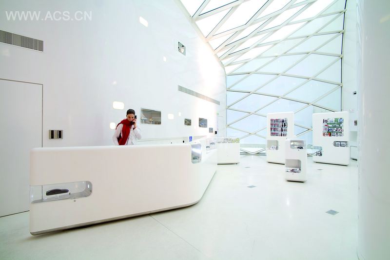The main role of the building is as a place to show cars, and we wanted to express this primary aim in the form of the space itself. The shape of the building itself is inspired by the shape of a car, it’s not an with a front, a roof and a rear, but something moulded with curves and fluidity, that s the front, roof and rear with a continuity that is like the form of a car itself, creating unity between the place and the product, and makes a rich and complex interior.