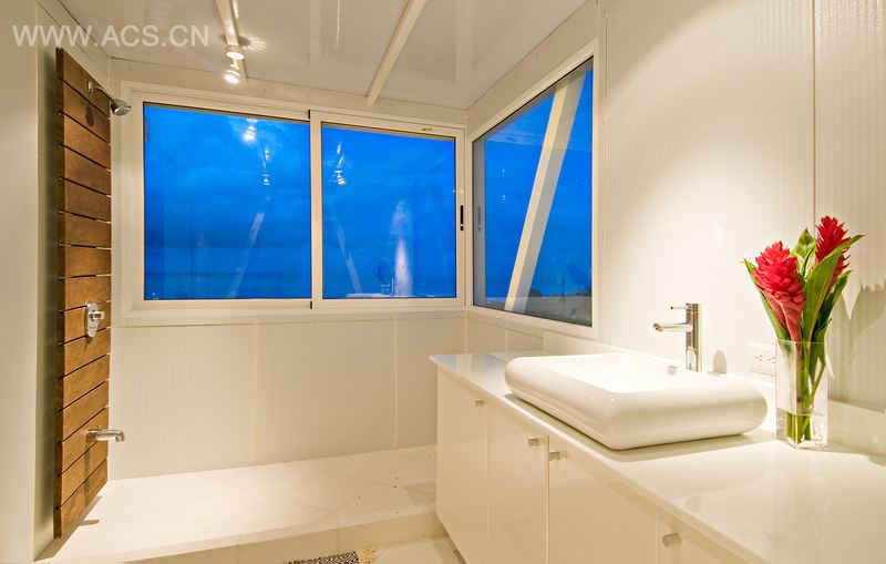 One important goal of Iseami house was its recyclable potential, therefore, the material selection needed to be 100% recyclable at the end of its lifecycle, therefore, recycled plastic, glass and mainly the steel (structure and panels) have been choose for the project. Plastic materials at the interior are not included to avoid the outgassing of any toxic compound found in certain plastics, sealants or aditives. Instead, the Versawall and regional materials as white mosaic floors creates a simple but well balanced interior.