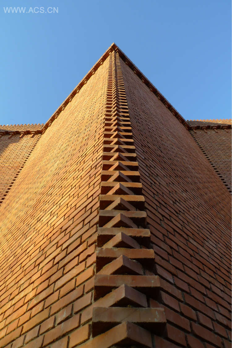 美术馆的入口廊道作为灰空间使得内外得以柔和过度,入口正中的钢化玻璃夹在两块厚度近600mm的红砖墙面上,产生强烈的材质对比。而当人从外部进入这入口空间时,室内较暗的光线使得玻璃犹如一面镜子,进入者能清晰地看到自己的身影。而当自动门缓缓打开,进入内部,截然不同的空间顿时倾泻而出。人的心亦随空间在一瞬间冷却,而当人们回望入口,却又发现它是如此明亮。这种神圣而又肃穆的基调在美术馆起点处便做了铺垫,使得人们能静下心来欣赏其中作品。进入内部是一个方形大厅,其中的圆形发布厅的下沉,两层的通高空间增加了建筑在竖向的深度,亦是对中式庭院的回应。另一边作为下行报告厅的巨大楼梯平台,媾和了希腊剧场的意向,剧场的意向继而改观了其东面踏步的错落高差,它们能用以人群散座;抬高到人视高度的小方厅,也能视为上行夹层的楼梯平台,其功能实则是小型展厅,而一圈展墙底下脱开地面的一条通缝,则是对展览场景的未来想象:在内部观展的观者将被裁剪为不能全视的下半截身体,引诱大厅内的观众进入其间。
