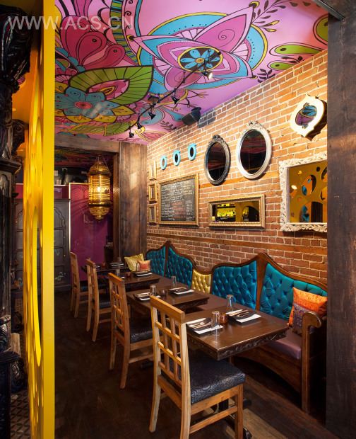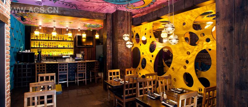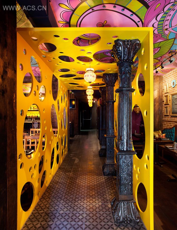 Jean de Lessard 设计的这座印度餐厅位于加拿大蒙特利尔,300平方米的室内空间拥有丰富且饱和的色彩,充满艺术的画作,粗糙复古的墙壁纹理,充满个性并带有印度风情的配饰,这些都深深的吐露了繁华的宝莱坞元素,黄色的镂空隔断给空间融入了时尚气息,新印式餐厅,似乎可以闻到浓重的香料香气。