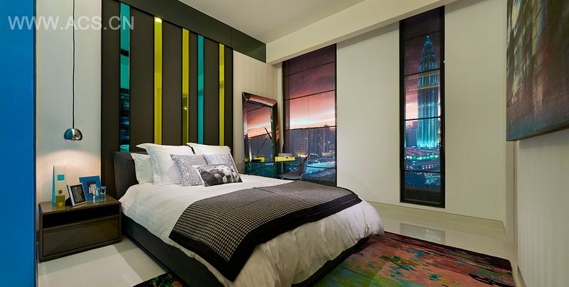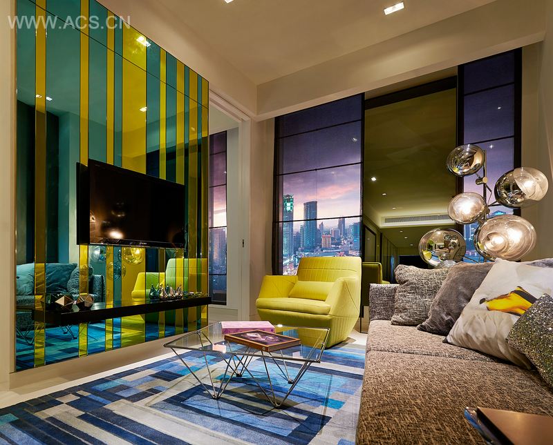 反光透明的设计理念以更加含蓄内敛的方式呈现在卧室中。作为中心装饰的床头板上有条形纹理,且时不时被天蓝色和黄色镜子打断。再加上桌后的凸起框镜,让室内设计温暖舒适。源自阿克曼时尚启发了轮廓和层次理念,即浴室设计背后的视觉。带有彩色纹理的玻璃,从卧室出分隔开来,形成阴影轮廓——成为了这处性感空间的最后一笔。