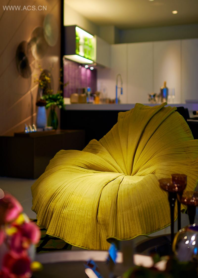 根据他的时尚秀,动感的色彩往往与内敛单一的色调相成辅。灰色的帘子与大量的天蓝色,黄色搭配在一起。染色的镜子加强了颜色的视觉印象,亦加强了空间感。来自阿克曼服装设计的灵感决定了垂直切口的墙壁的选择,加高了空间的高度。尽管生活区面积有限,透明的桌椅使之看起来宽敞。无数的柔和造型的金色挂饰,闪闪发光,为室内设计书风格写完美句号。设计的最后一笔来自一个黄色的雕塑扶椅,灵感源于阿克曼设计中的男性斜线条。