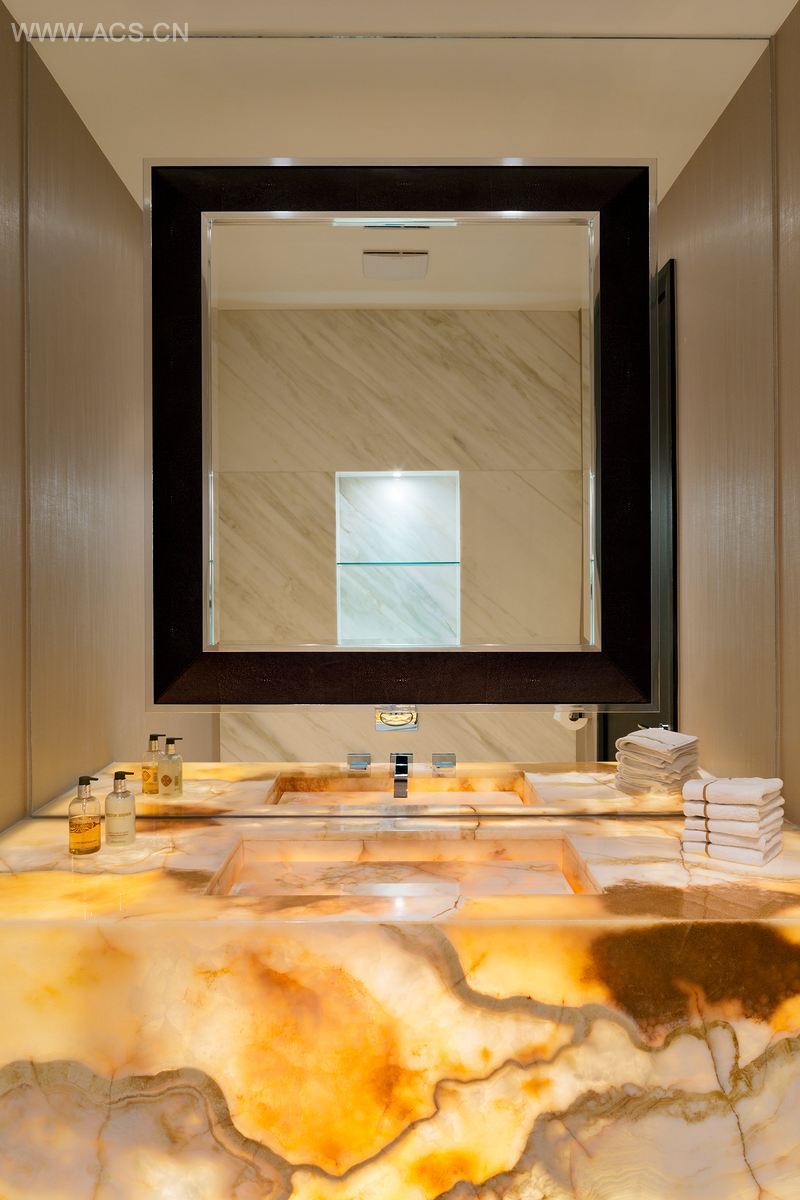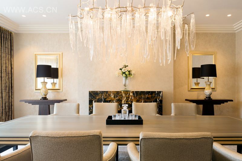 主客厅以丝绸和天鹅绒进行装饰,带来温暖质地。为使客厅更加多变,适于正式与非正式场合,电视机被安放在特殊的双向观测镜背后,观测镜又将壁炉腔巧妙遮掩。