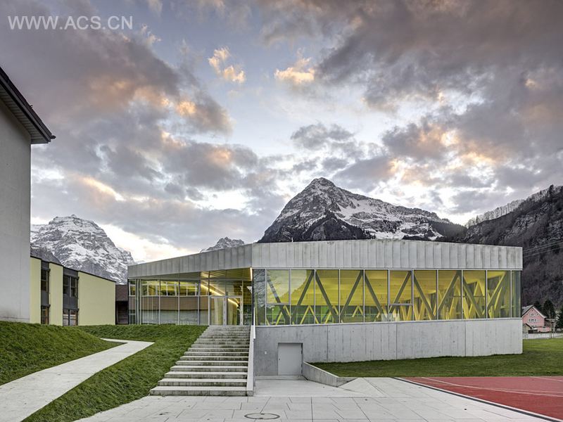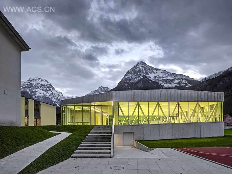 新体育馆与现有的两栋学校建筑相邻,引入了运动、娱乐和俱乐部生活的多功能概念。体育馆三面可用于课间玩乐和休息,因而这里成了新焦点和集会场所。构架位置、平坦屋顶体积以及入口区域三者使体育馆与户外运动设施间形成和谐过渡。这些特征值得给予特别关注。