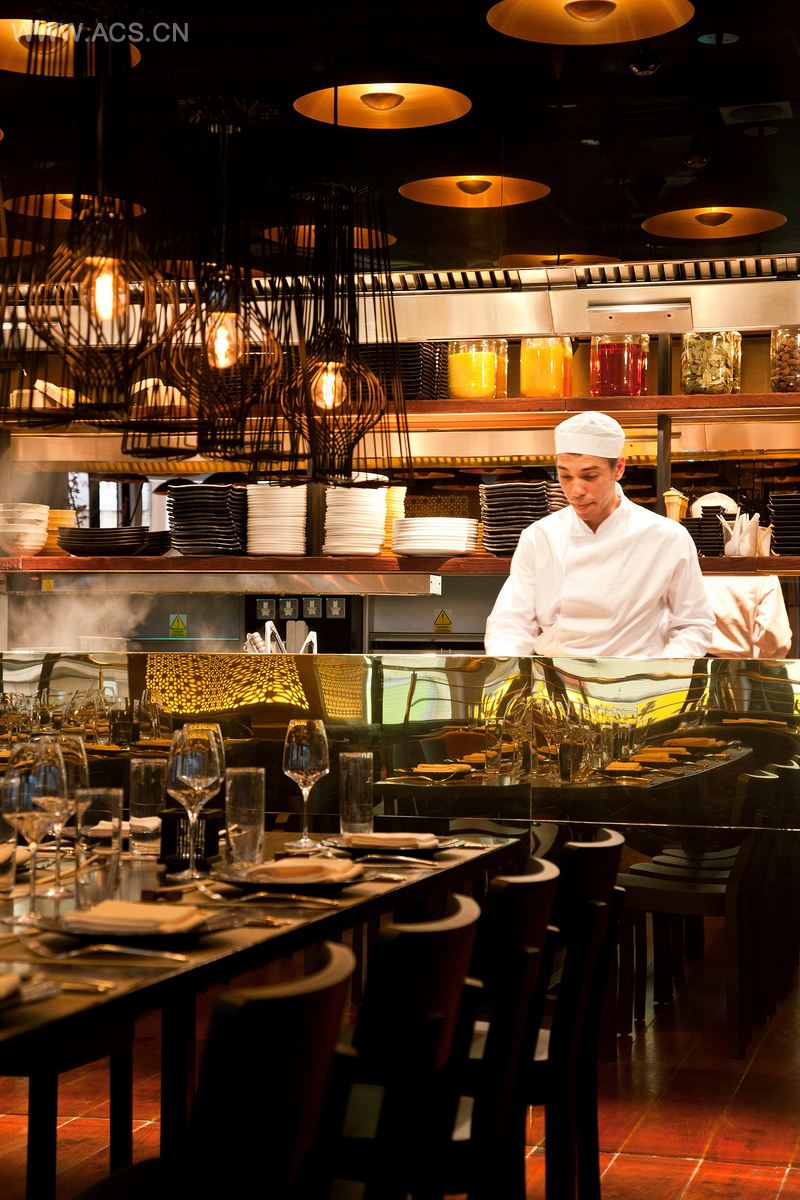 Monumental brass lanterns with laser-cut patterns give a warm and soft glow and shed an extraordinary decorative light throughout the restaurant area. Another eccentric light creation can be found when looking up into an endless sea of wok lamps hanging from the ceiling. Of course, Spice Market is not just about the cooking inside the kitchen.