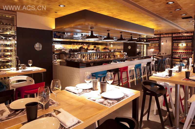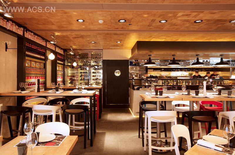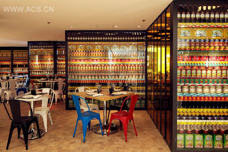 Spain’s colorful daily life was reflected by using typical Spanish products, flavors, ingredients and colors as the basis for the cabinets which are filled with items such as bottles of sherry vinegar, tinned anchovies, bottles of wine and much more besides. The façade of the restaurant consists of blue, yellow and red transparent panels that create a smooth transition from the brightly lit passages of Harbour City into Vi Cool, while the eye-catching cabinets attract and welcome guests from afar.