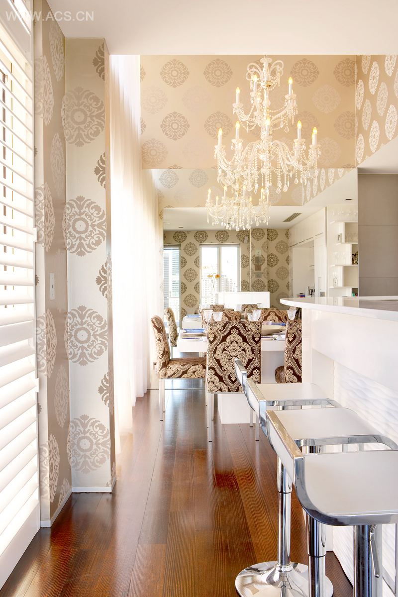 Glamorous wallpaper and wall to ceiling mirrors plus an oversized mirror designed by Christopher Guy have been used to create dramatic results. In the dining room, kitchen and stairway, buff coloured wallpaper with silver flocked medallions creates the perfect backdrop for the eclectic style.