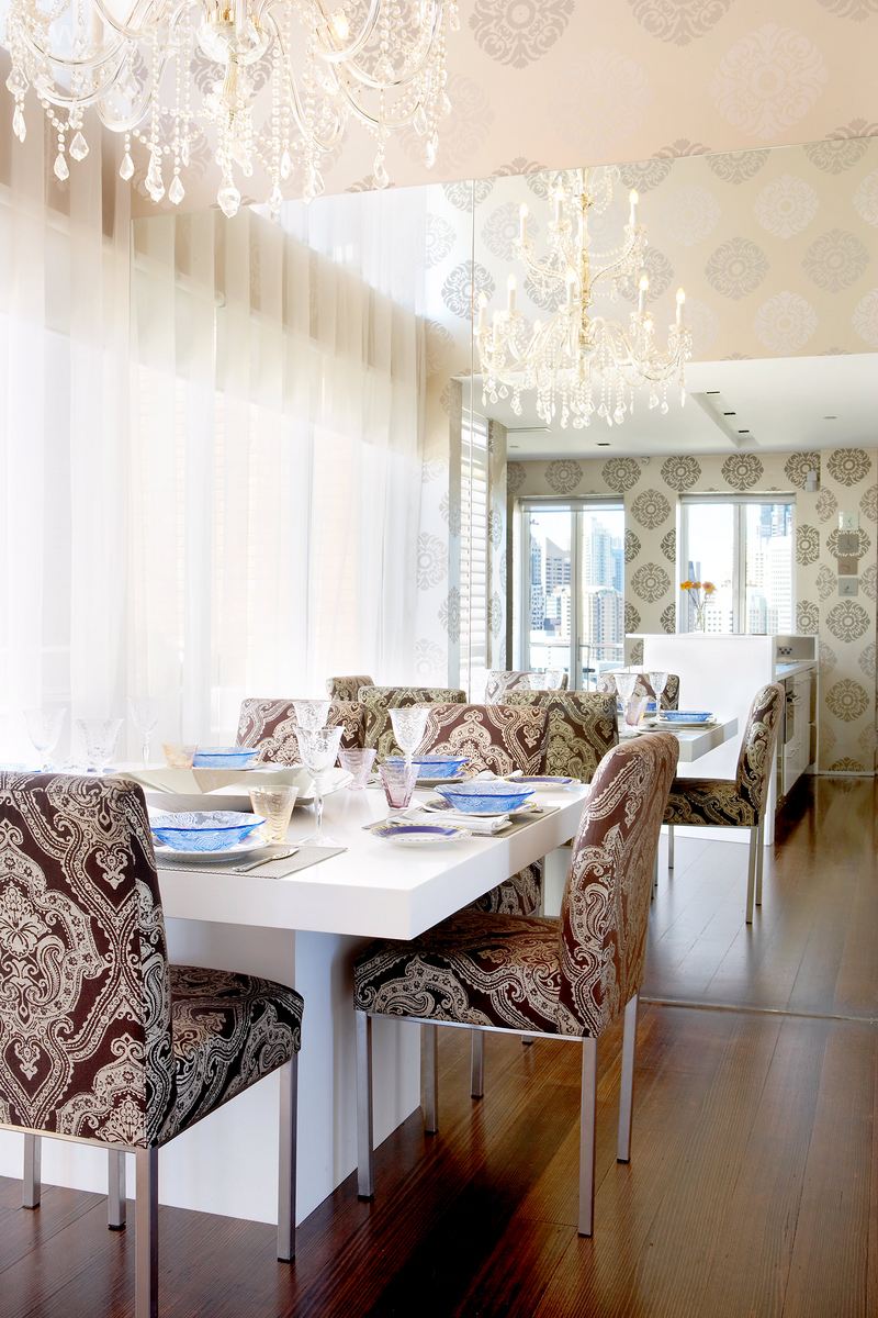 A floor to ceiling mirror in the dining area reflects the crystal chandelier with dining chairs upholstered in black linen with a decorative gold motif adding a touch of luxury.