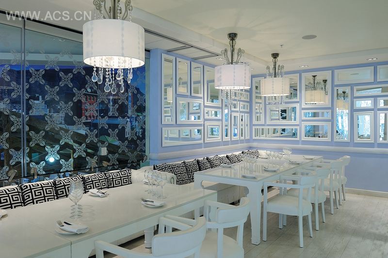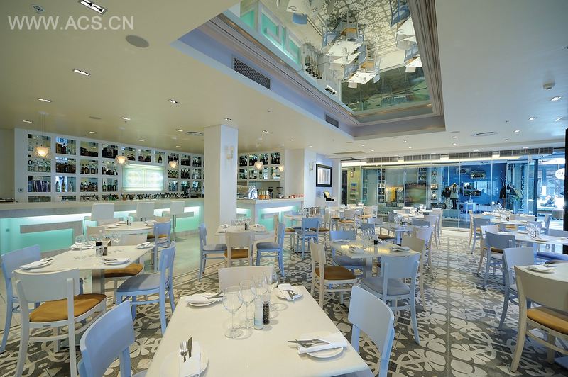 高雅的Kuzina餐厅坐落在南非开普敦中心区域。这个项目的难点是在异国普及地中海精神。淡蓝色、轻松的白色和装饰性因素组成了卫城博物馆设计品和古典希腊图案的选集,形成了完全不同的风格。这种舒缓的气氛源于白色的皮椅、地板砖上优美的图案、喷砂玻璃的设计和独特的照明设备,增加了空间内明亮而新鲜的现代气息。Kuzina餐厅不仅提供了希腊美食和文化的体验,也为特殊场合的私人用餐提供场所。设计师利用柔光吊灯、皮沙发、雕塑桌子和镜子合成体来增加空间魅力,使得这里的环境更加振奋人心。私人区可轻松容纳30个人,主区则可容纳80个人。