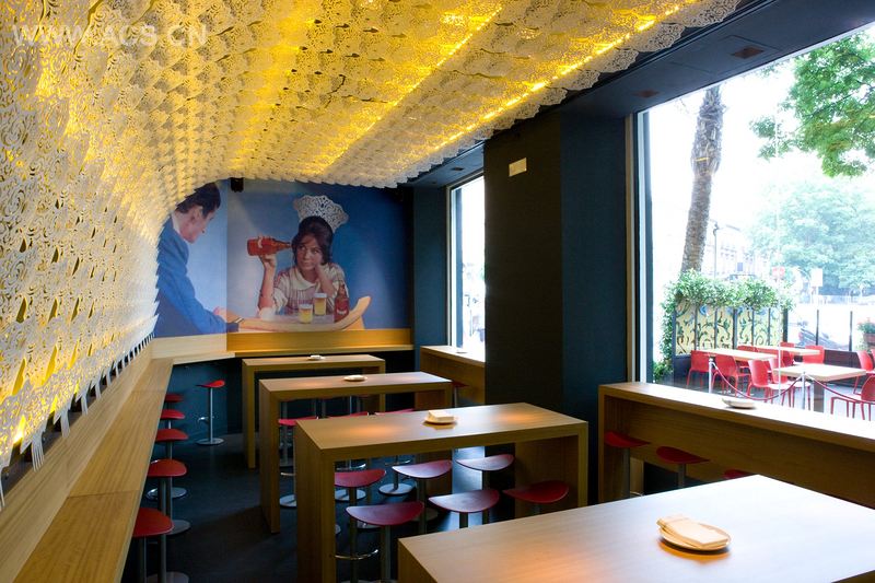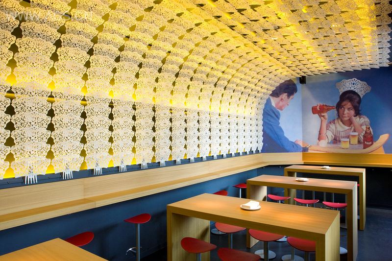 本案埃斯塔多· 普罗的建筑理念灵感来自Paco Ro n c e r o对于“典型的西班牙”应该是什么样子的理解。“烹饪”是在保留其原材料的基础上的创新和实验。他们提议重新定义西班牙的流行的象征性意象,将传统加以扭转来创造出时尚而精致的同时又有亲民的氛围。