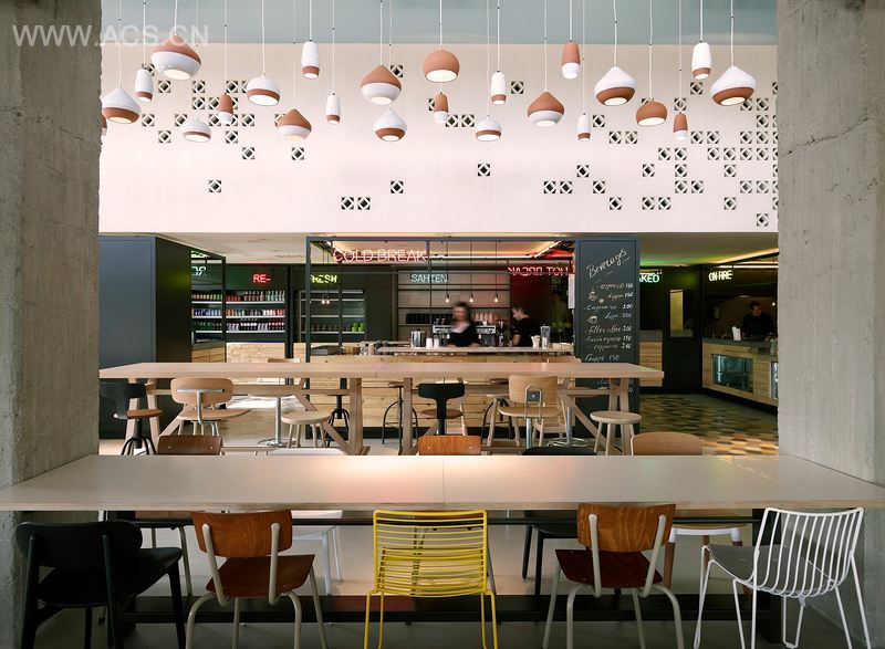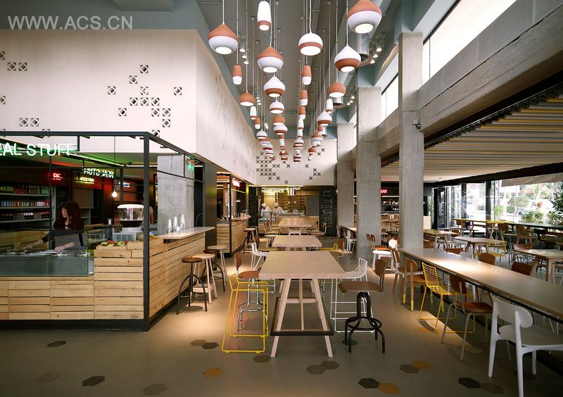S o u k 餐厅位于雅典海岸线上的格来法德, 是一间2 4 小时营业的黎巴嫩餐厅, 供应黎巴嫩街头的各种美食。餐厅的大部分座席处于已有建筑向外扩展的附加结构中, 结构混凝土立柱位于空间中部, 被用于分隔一系列独立的食品位, 这一设计灵感来自于贝鲁特街头排档。