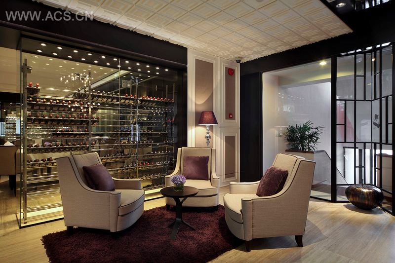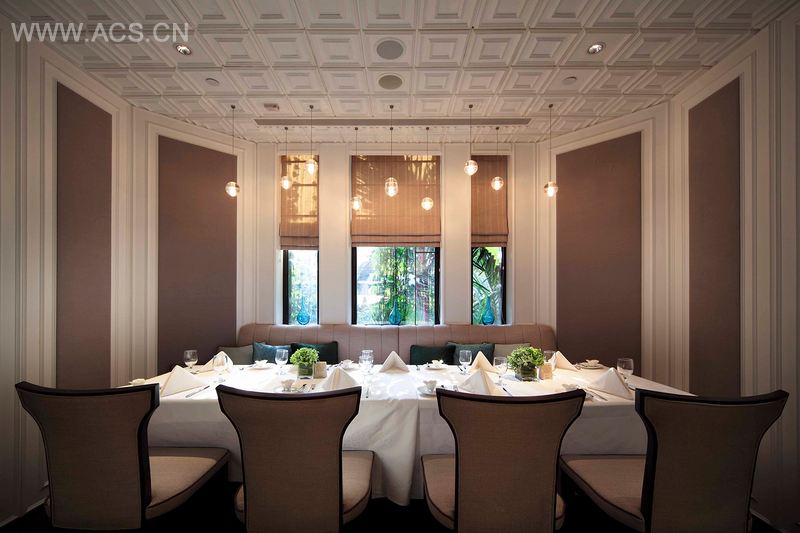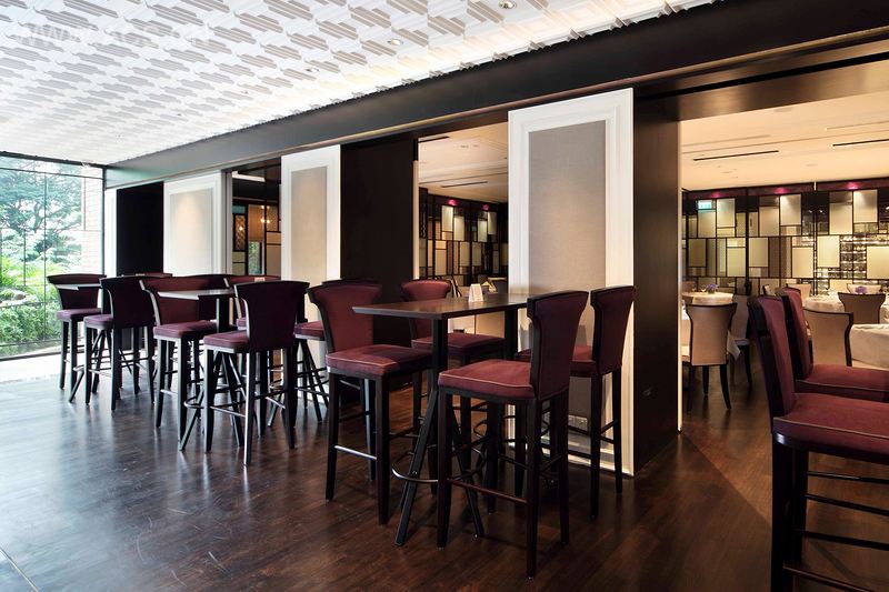 Eastern influences come into play through the use of movable dividers, bringing to mind traditional Chinese screens. By clever manipulation, these screens can be used to expand the bar area.