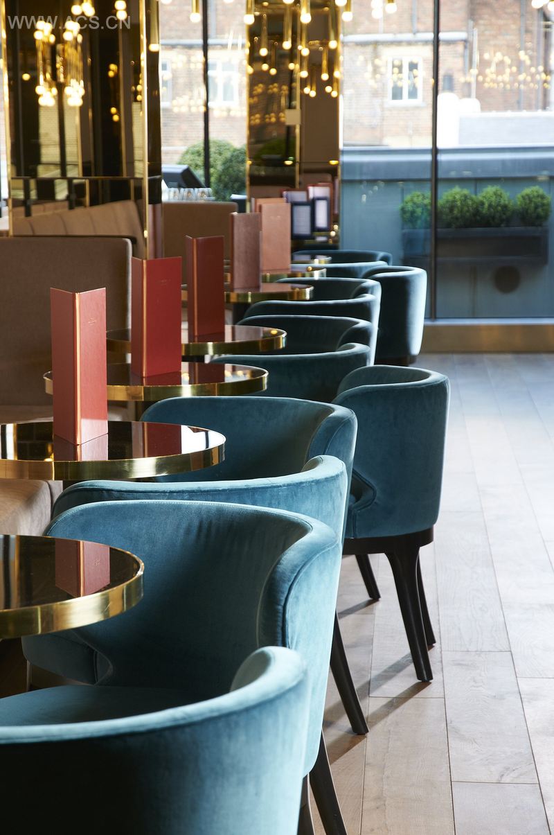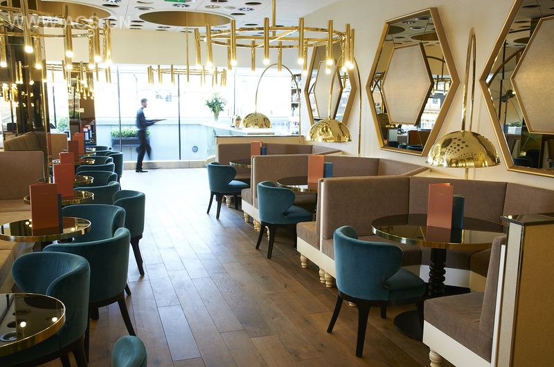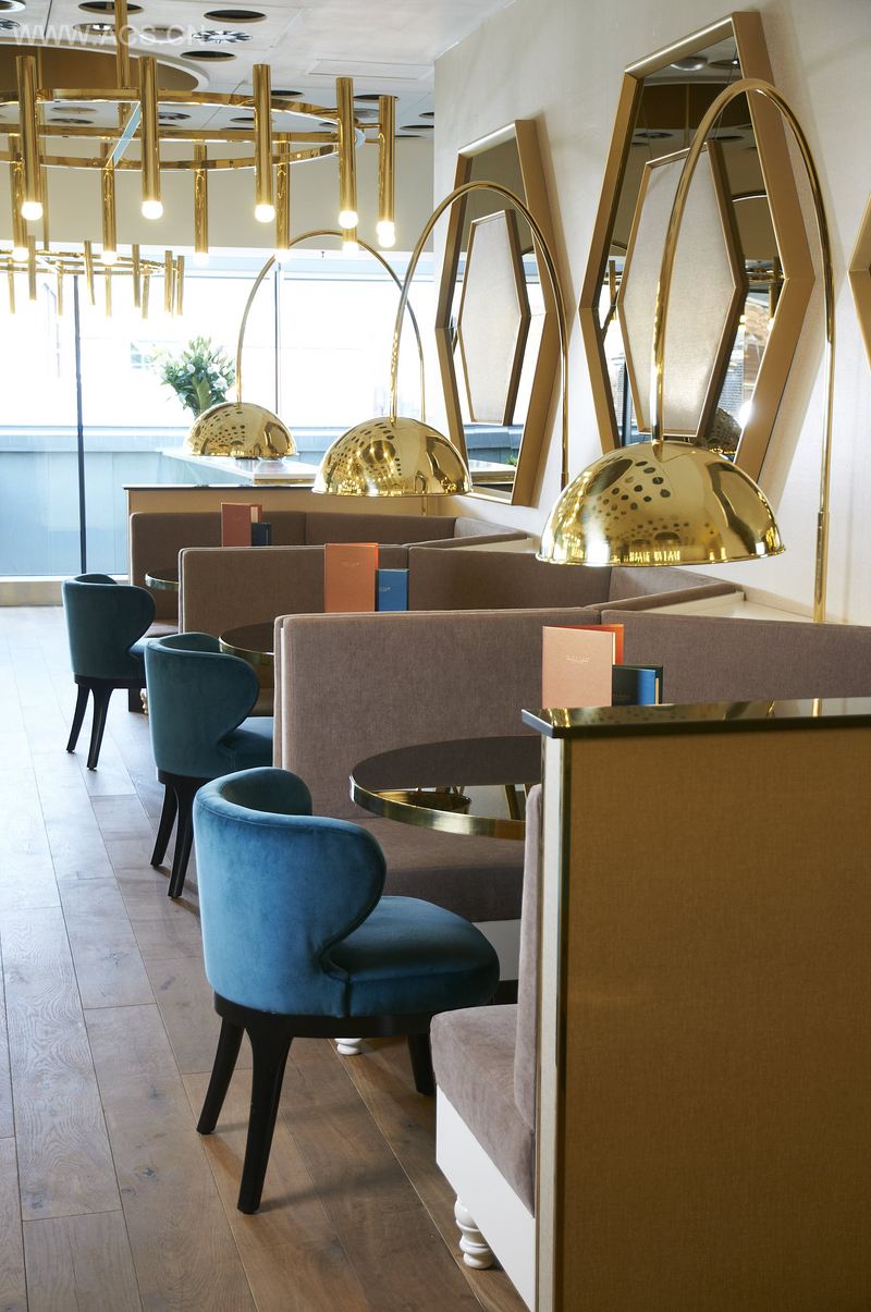 Sophistication fuses with contemporary classic design, as Harvey Nichols’ Fourth Floor ups the glamour and takes customers from day to night in a sweep of luxury. The chic space complements the high-end fashion setting, from which inspiration is drawn. The space is brought to life with stunning brass finishes. llic shades mesmerise with columns cladded in bronze mirror, and domes shining with gold leaf. On entry, the reception desk delivers a statement of bold modernity, with a faceted polished brass finish. A feature wall displays hexagonal mirrors with fabric centres in luxurious shimmering cream and gold, whilst a central fretwork screen artistically divides the space. Grand chandelier lighting defies expectation, with modern seating upholstered in black and white leather retaining an inner city cool factor. For pops of brilliant colour, teal velvet chairs are inviting, mirroring the servery, which is covered in deep teal tiles. The design is dramatic, beautiful and alluring.
