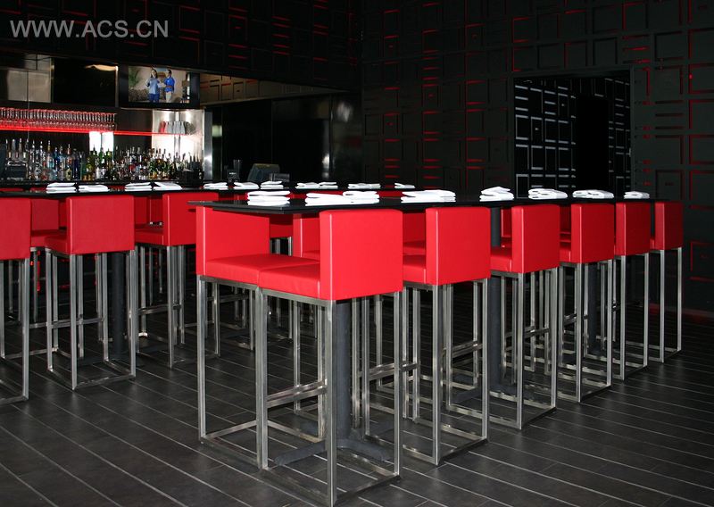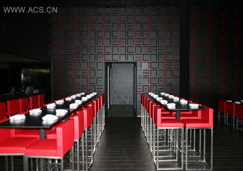 Accent is a fusion restaurant, western cuisine with eastern accents, hence the name and logo, English abstracted and mispronounced with geometric regularity that almost looks and sounds Asian. This graphic slang covers all the walls and ceilings in repeated accents.