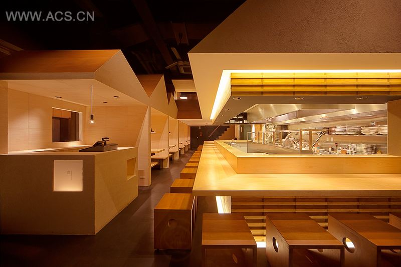 Inspired by Nagaya (a traditional Japanese tenement house) style, there are different shapes of triangle roofs inside the shop and each table under the roof is looks like a dining room of each customer. Yet one side of the each cell is wide open to the center of the shop and it connects customer with friendly staffs, cooks in the kitchen and other customers.