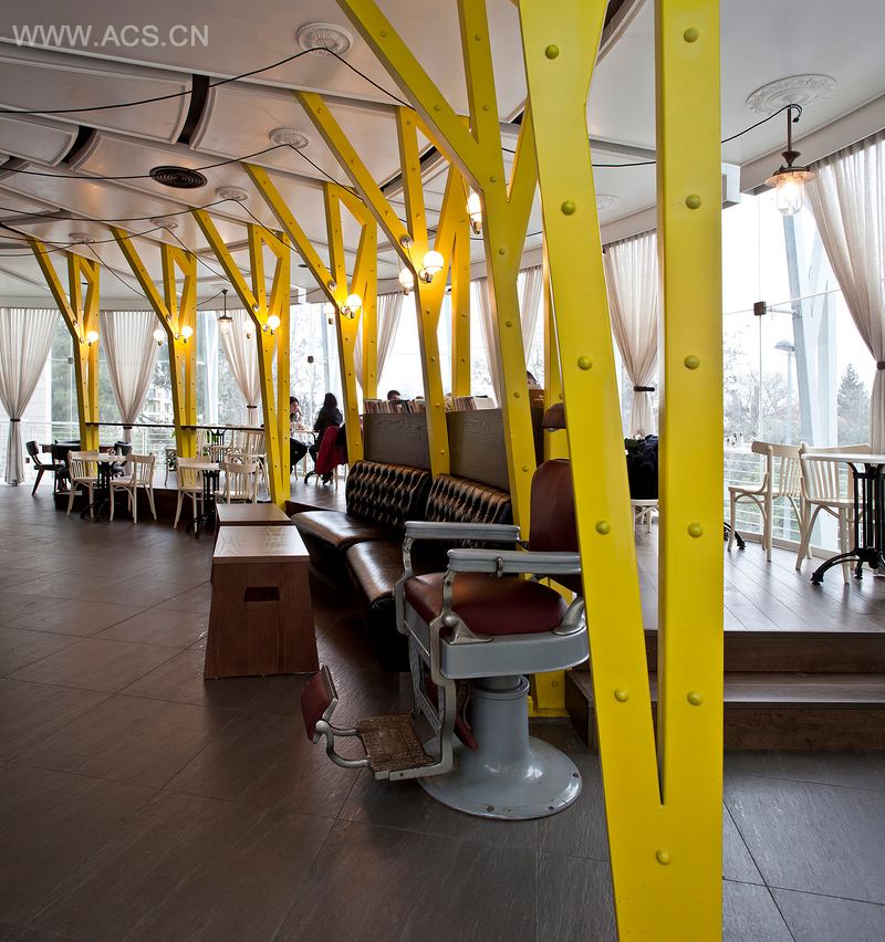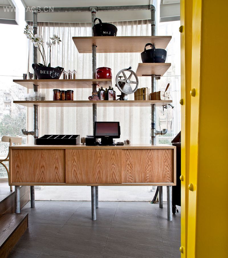 厨房被设计成工作间的形式,被铁网包覆着,摆放着主厨的厨具。紧接着,正中间是一个大的公用餐桌,由旧抽屉制成。