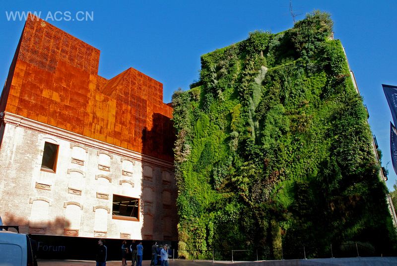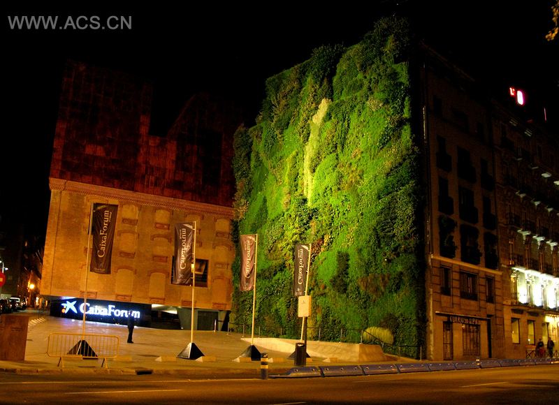 马德里凯撒广场文化中心的垂直花园不仅是西班牙的第一个垂直花园,更是迄今为止竣工的最大的垂直花园,种植面积达460 平方米,不留一丝间隙。项目如一幅丰富多彩而跃然欲出的风景画,视觉上引人入胜,令人惊艳不已。实际上,该设计还注意与环境协调一致,达到环境管理的功能。垂直花园内有250 种不同品种的植物,共15,000 株,形成了一个天然挂毯,给人留下深刻的印象。它把马德里凯撒广场文化中心周边发达地区的大厦转变成了一个令人惊讶不已的花园。新公共广场连接了普拉多大道和广场北端,该墙体花园则完全覆盖了广场边上大厦的墙壁,也就是说,这座墙体花园靠近普拉多大道34 号。