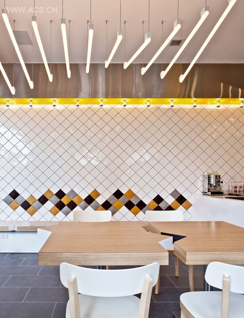 我们决定使用现代而便宜的材料、清晰的线条和明亮的色彩来创造一个有活力的年轻的空间,以吸引潜在的现代的顾客。