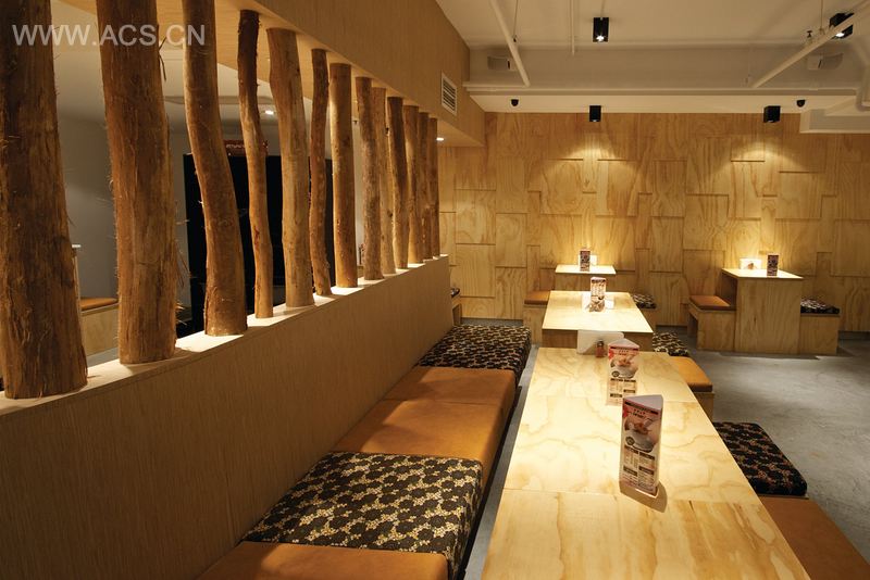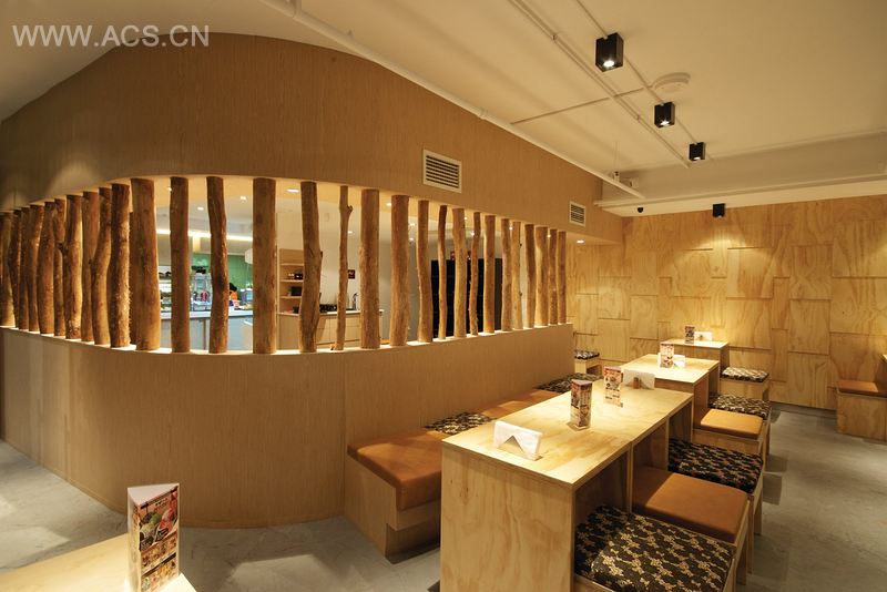 On the second floor identical floral prints mimicking creepers were found in lampshades suspended off the ceiling, as well as on the stools and counter front. Hundreds of pieces of plywood were put together to make a wall of weatherboards, imitating the woods caretaker’s hut. Soft, indirect lightings bouncing off walls and ceiling created a serene ambience while highlighting the architectural elements that spoke of avant-garde and grace.