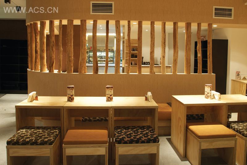 Vie Studio responded to the existing building forms, creating new bench spaces and banquet seats reflecting the curve of the ceiling and window fascia. Keeping the ceiling and floor colour neutral, white paint and polished concrete floor were used to accentuate the warmth and golden hues of the timber and plywood. Extensive use of natural materials and colours blended effortlessly well with the delicate fabric of floral prints to depict a contemporary woodland setting.