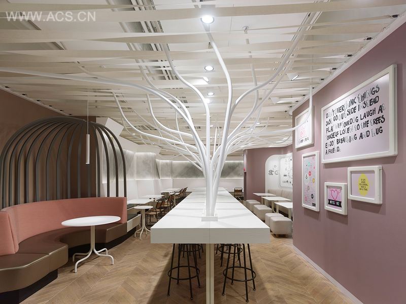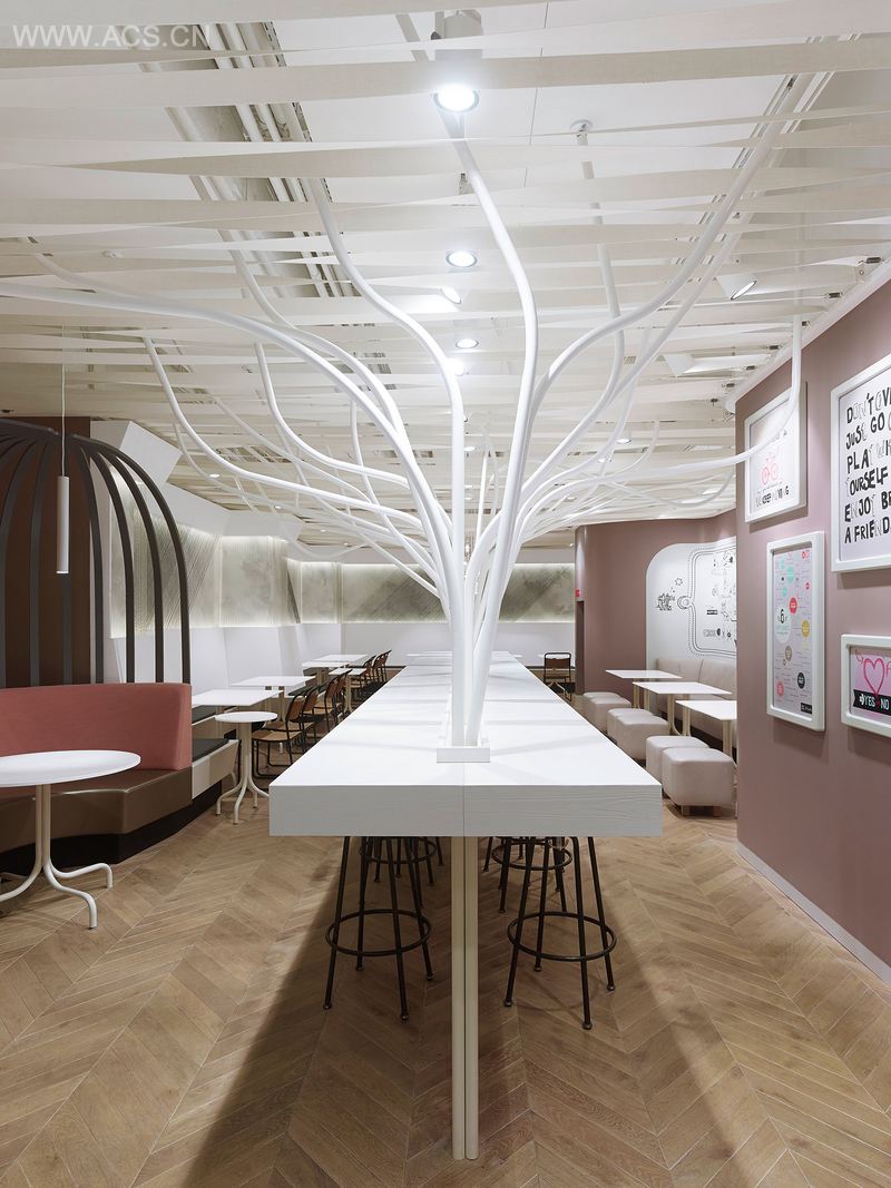瑞士餐饮连锁“not guilty”是诚信和营养食物的体现,销售各种极具想象力的沙拉和点心。本店位于苏黎世市中心,与2013年开业,是“not guilty”连锁的第三家店面。这间旗舰店内,人间天堂的设计理念贯穿室内空间,让人沉浸在自然的和谐中。长形的开放的餐厅,熟悉的色调,天然橡木地板的纹理与精致的白色柔和色调的结合,以热情的姿态欢迎着来客。入口处的焦点是爱色的沙拉吧,以及设计得好似厨具架的菜单木板。即使身处户外,也仿佛被热情邀请着进入,与其他顾客一起围坐在长长的位于中央的高桌子旁,头上是由树枝组成的华盖。在其附近还有一些其他类型的座椅,满足所有人的需求与品位。店内所用的主要材料纯粹而干净,正好与品牌连锁店的整体标准相契合。有趣而意想不到的元素例如扭曲的帆布天花、云状物、麻线墙面图形,反映了“not guilty”大家庭的热情和诚信及其对于细节的看重。
