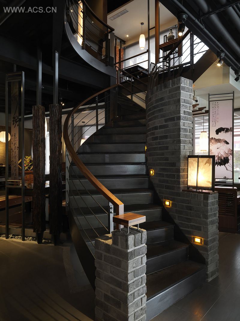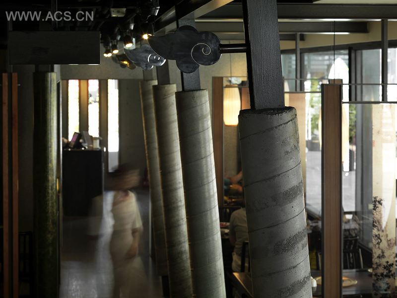 Cylinders, grilles, screens and span beams make the blend of virtuality and substantiality. Brick, metal member, exposed concrete, and the texture performance of terrazzo- these materials and the color sense are smoothly peaceful to set the tone calm and reserved. Shaped cabinets made of metal member and solid teak display and decorate Art.