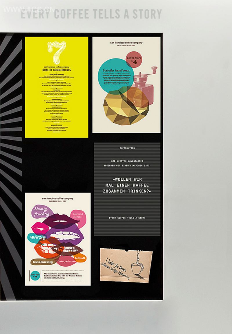 SFCC是一家咖啡连锁机构,目前在德国有20家咖啡店,大部分在南部。新的集团建筑将支持其计划在全国范围内的扩张。设计赋予了品牌全新的形象。不同的座位安排形成典型的美式用餐方式。浅色的软垫和家具与企业专用色蓝色一致,具有很高辨识度的放射状图形被用于天花板上。外卖食品例如咖啡、茶及其他产品被安置在单独设计的陈列架上,细节处应用了和菜单板上一样的图标处理。海报上休闲形象地陈述的咖啡故事,突出了高品质的产品。各种组件,例如有机形状的灯具、可折叠柜台,描述了谦逊的氛围及轻松的美国式生活方式。