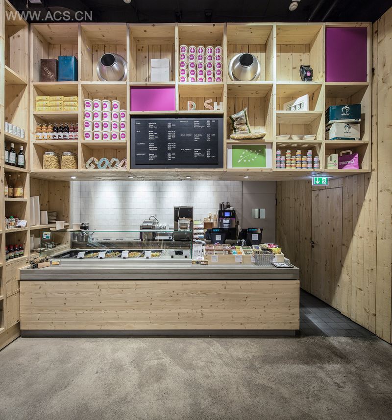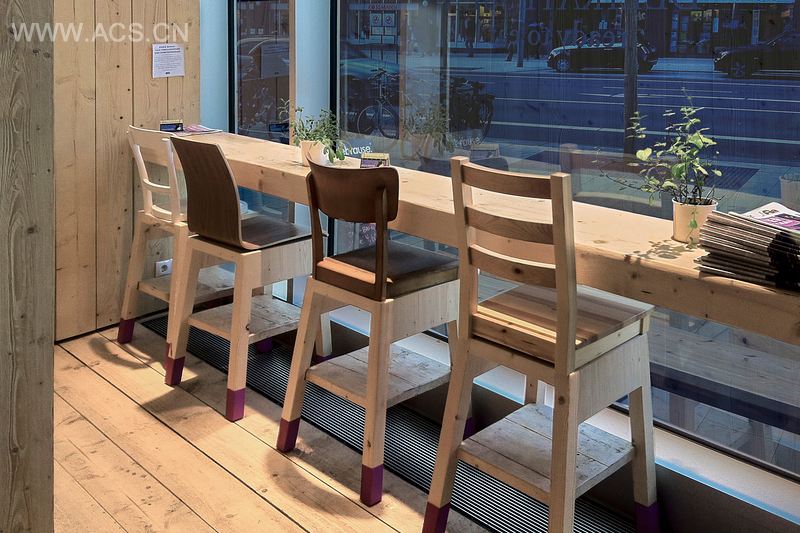 巨大开放的外墙使得室内空间一览无余,实木板材包覆的空间内完美地展现着WakuWaku世界的各种产品。一面墙上是从顶到底的架子,将产品陈列装置和正面是玻璃的冰箱整合在一起。长长的中央柜台,与其平行的壁龛充当着座位,消费者可在此谈话交流。不同形状的椅子打破了传统座位区景观,让人联想起之前的WakuWaku商店,椅子腿上使用了WakuWaku品牌专用色。未经处理过的木材与品牌的生态可持续性定义相一致。粗糙的木质表层与Chris Rehberger创造的复杂的墙面图案形成对比。