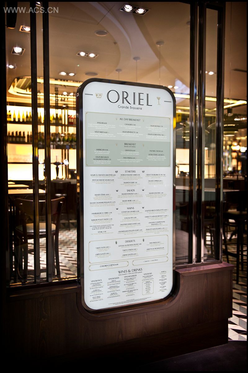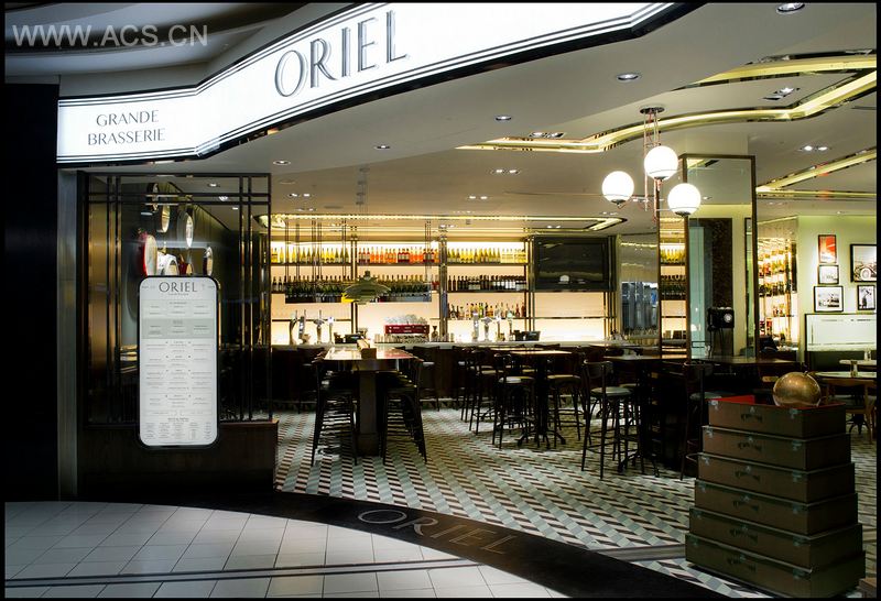 位于斯隆广场的奥利尔餐厅曾经是近四分之一个世纪以来伦敦最受欢迎的啤酒屋之一。当餐厅迁到希思罗机场后,业主委托设计师对这间具有历史形象的餐厅进行重新包装。本案的设计灵感来自于餐厅新地址——伦敦希思罗机场,设计理念赞美了20世纪30年代的装饰艺术运动,在那个时期,旅行是一件美丽的奢侈品。