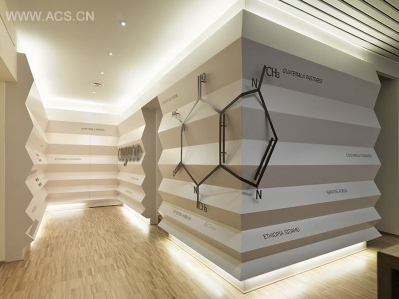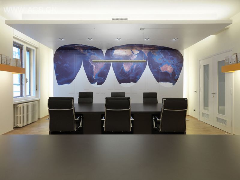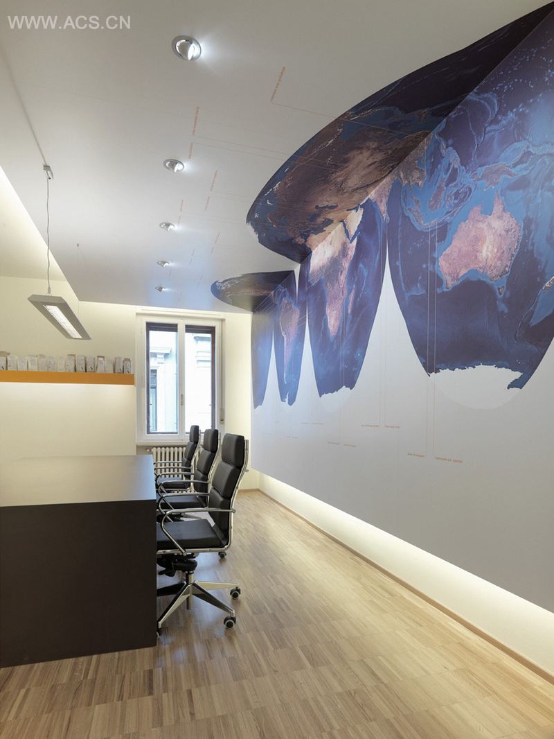 意大利的里雅斯特市是世界最重要的咖啡贸易港市之一,COGECO是一间咖啡原材料的贸易公司,办公室墙上抽象的世界地图强调其全球贸易的广泛性,前厅的化学元素分解式则强调其原材料的实验与研发。