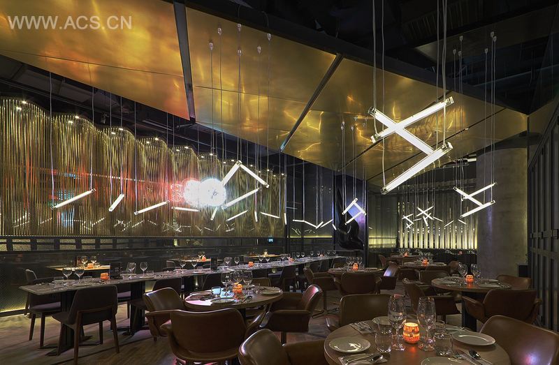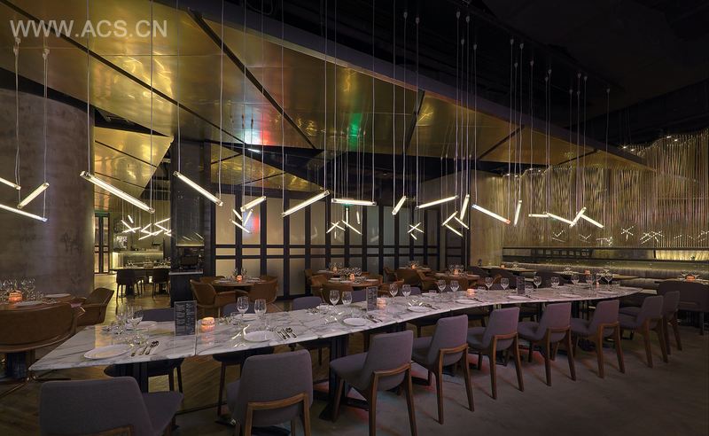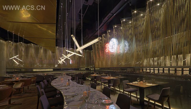 G九的场地还被一个L型转弯角分割成了两部分,其中较小的一部分被设计成了晚餐时间段的入口及吧台空间,同时主用餐空间面向连卡佛百货区全方位打开,此区域很好地运用了带着工业磨砂玻璃的折叠门,自然而美好地融入连卡佛商场的整体环境中。