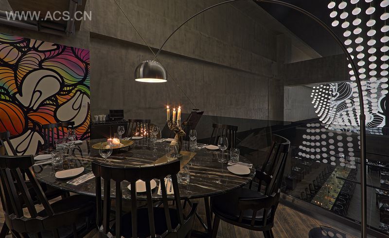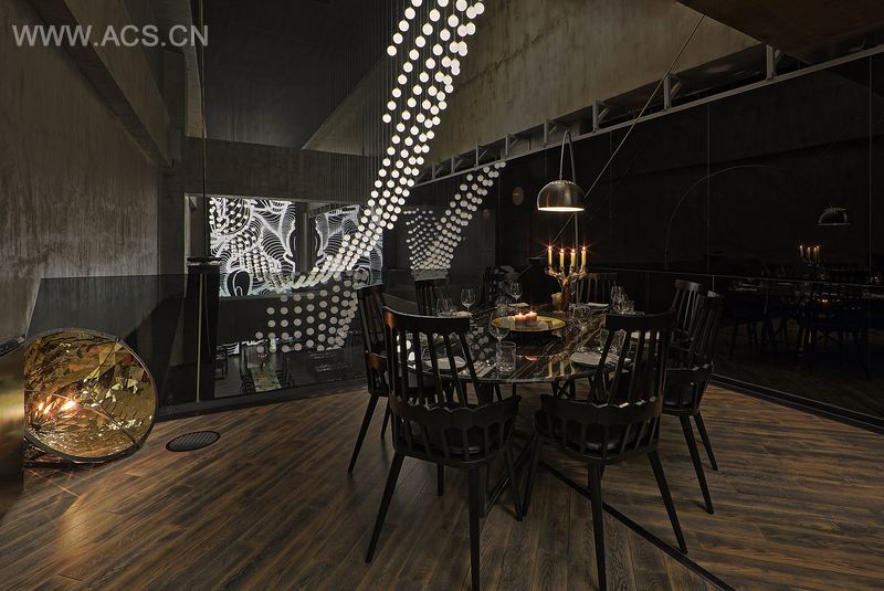 黄铜包裹着一张22米的社交长桌,桌子将餐厅空间一分为二,既拥有了餐桌的功能又具有T台的功能。贵宾用餐区域高高在上,用旋转而高挑的设计凸现其地位尊贵,开阔宏伟的空间呈现给VIP客户以尊享的地位。在这里,顾客不单单可以享受美食,同时可以欣赏独特的灯光装置和艺术作品,一种三维深度互动体验,顾客可以运用动感的手势,让INSA的艺术品呈现出动感、迷离而绚烂的光影画卷。